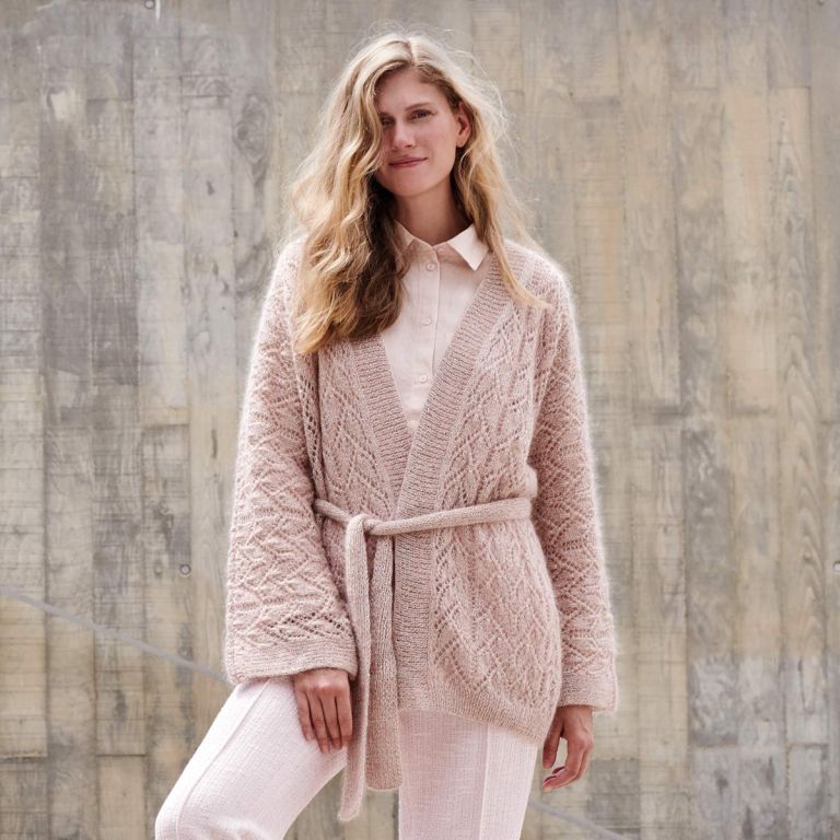 Create an elegant kimono-style cardigan with this exclusive pattern from the All Seasons 6 magazine. Knit this timeless piece with a lace motif using two strands of yarn—50 Mohair Shades and Combine & Shine from Concept by Katia—, wide sleeves and a belt. It’s perfect for pairing with palazzo pants or jeans. Get the pattern and start knitting this unique garment today!