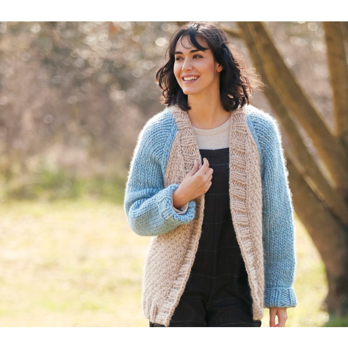 Embrace your knitting passion and create this stunning bicolour chunky cardigan without buttons. Pick your favorite Love Wool shades and let your imagination soar!