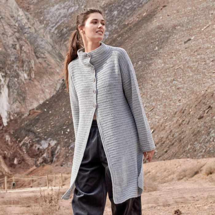Create an elegant long crochet cardigan with Silky Lace by Concept by Katia. This frock coat with a funnel neck is fastened with 5 buttons at the top and has side slits for added comfort. Get the pattern to knit this versatile garment in all your favorite colors!