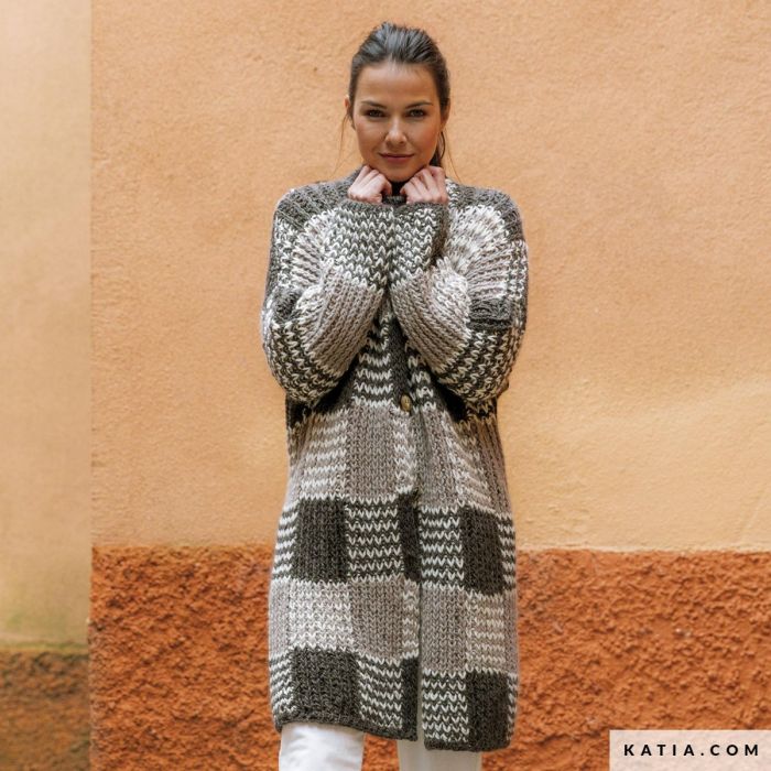 Create a beautiful, checkered pattern by combining just 3 colours using a textured stitch. Knit a mid-length jacket with a square neckline and tortoiseshell button closure with Supreme Merino. A timeless design that you can customize by choosing your own 3-colour combination and playing with the placement of the squares to break up the symmetry.