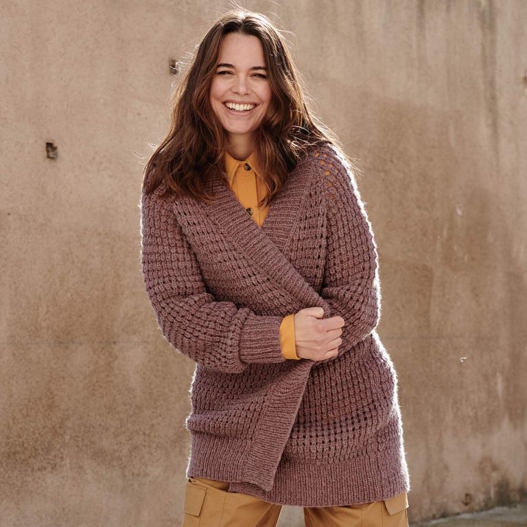 Cotton-Merino Glam raglan-sleeved oversized cardigan pattern Elevate your daily looks with this raglan-sleeved oversized cardigan knitted in Cotton-Merino Glam. This buttonless cardigan features oversized cuffs and ribbing for a sleek and modern look. Get this pattern now to showcase your unique style!