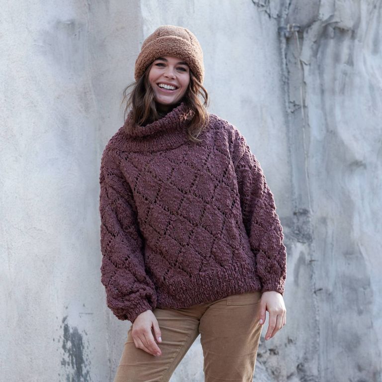 Cotton-Merino Volume large lace diamond sweater pattern Knit your own cabled sweater with a double funnel neck. Made from Cotton-Merino Volume flamé yarn for a comfortable, modern, and inspiring look. The perfect garment to combine with a skirt or micro-corduroy pants. Find the PDF pattern now in the Concept by Katia 15 magazine!