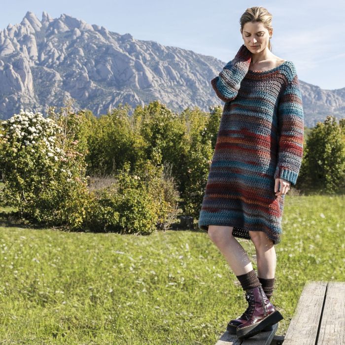 Oversized crochet dress that adapts to all body shapes and styles. Wear it with boots, shoes or trainers. Using Katia Azteca, knit with colour combinations to crochet this Winter dress.