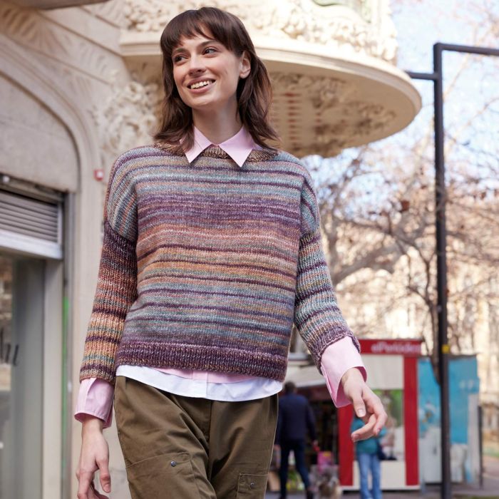 This casual sweater combines a straight body and stripes with ribbed sleeves that enhance the multicolored effect of Concept Cotton-Merino Paradiso, a stable, soft blend of extrafine merino and cotton. A simple, stylish pattern for knitters who want to make comfortable, versatile garments with yarn that is easy to care for.