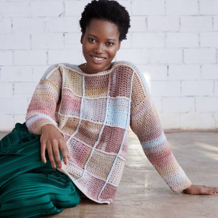 Discover this crochet sweater pattern that uses Angelo by Concept by Katia, a light blend of virgin wool and polyamide in soft pastel colors. Made up of 25 granny squares joined in different directions and featuring sleeves in double crochet, this garment stands out for its original structure and tones that perfectly match dark outfits. Have fun crocheting your own sweater with this pattern from the Concept Multicolor magazine!