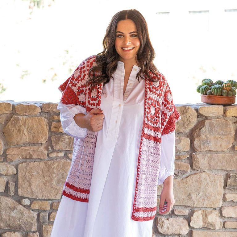Cotton 100% granny square jacket plus size pattern Are you looking for a cute crochet cardigan for summer? Take a look at this granny square and lace design in two contrasting colors! Made with Katia Cotton 100% yarn, this garment is perfect to keep cool and comfortable during the hottest months of the year. It's also perfect to wear with flowy dresses or skirts for an elegant and cool look.