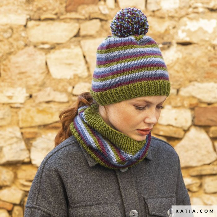 Add colour to your Winter looks with this striped neck warmer and hat set. Create your own colour combination among the wide range of Merino Aran colours. Download the free pattern and knit matching neck warmer and hats with pompoms for you and the entire family.