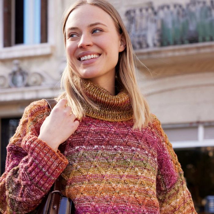 With a funnel neck, wide straight sleeves, and texture — this sweater stands out thanks to the volume and colorways of Concept Cotton-Merino Paradiso. A stable and soft blend of merino and cotton that is easy to care for. A perfect pattern for knitters who enjoy eye-catching results and all-over cables.