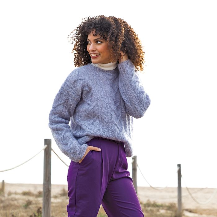 Ingenua lightweight cabled sweater knitting kit Knit a beautiful cabled sweater using Katia Ingenua and our PDF pattern. Use Ingenua mohair yarn to keep warm with a fine and lightweight garment. With a round neckline and chic mauve color, this kit is perfect for any occasion.