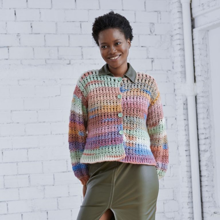 Discover this straight-line jacket pattern crocheted with Angelo by Concept by Katia, a fluffy yarn with vibrant colored stripes. Featuring a charming polka dot stitch, a lovely round neckline, and elegant matching buttons, this garment adds a modern and cheerful touch to any monochromatic look. Start crocheting your new jacket today!