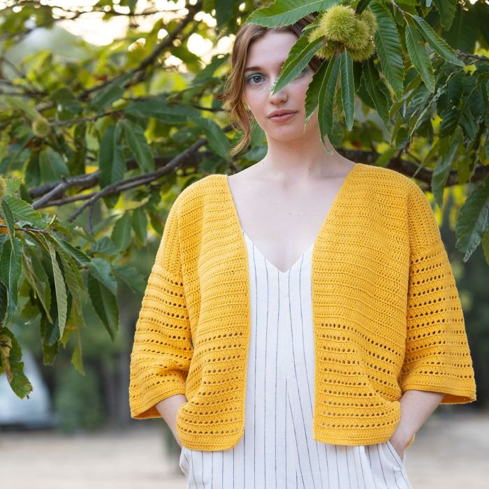 A women's open front crochet cardigan with eyelet stitch detail on sleeves and lower part of body crocheted using Fair Cotton. Fair Cotton is an organic cotton, respectful of the environment and free of any toxic substances. Ideal for sensitive skins.