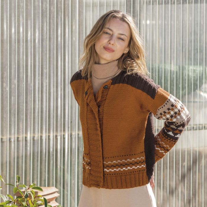 Short knit cardigan with centre front snap fasteners and a retro style jacquard design on the sleeves. Knit the back and fronts in different colours like our model, or use one colour to unify both parts. Adapt it to your own taste!