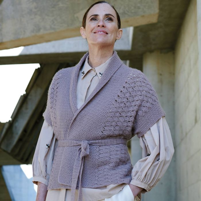 Atenea kimono-style belted vest crochet pattern This kimono-style crochet vest features a tuxedo collar and a wide belt. The powdery color of Atenea yarn is perfect to give your look a romantic vibe. This is the perfect piece to wear with both pants and midi skirts.