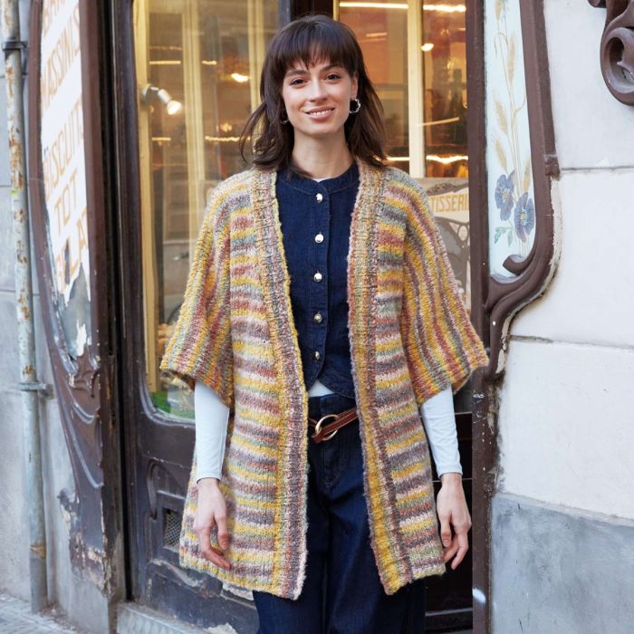 An open kimono-inspired cardigan knit with Concept Shibuya, a brushed bouclé yarn with sherpa texture. Its light structure and multicolored palette create a unique piece, ideal as a transitional overshirt.