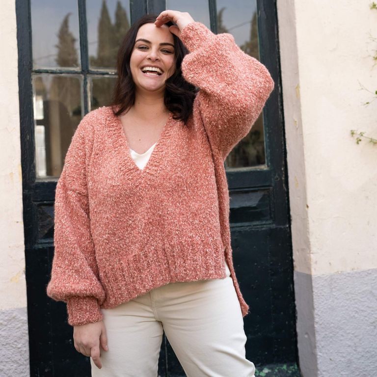 Komorebi high-low pullover Katia Plus knitting pattern Make this modern and flattering Katia Plus pullover in plus sizes with a V-neckline. Perfect for any occasion thanks to its large ribbing, puff sleeves, and the fantasy yarn that gives it a special vibe. Knit unique garments with Katia Komorebi!