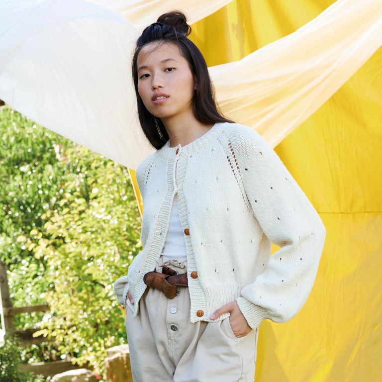 Andina Cotton women’s lace cardigan knitting pattern This women’s lace cardigan is knit with Andina Cotton yarn and circular needles. A beautiful round neck cardigan pattern, fastened with five buttons, and featuring puffed raglan sleeves with eyelets. A very urban retro style.