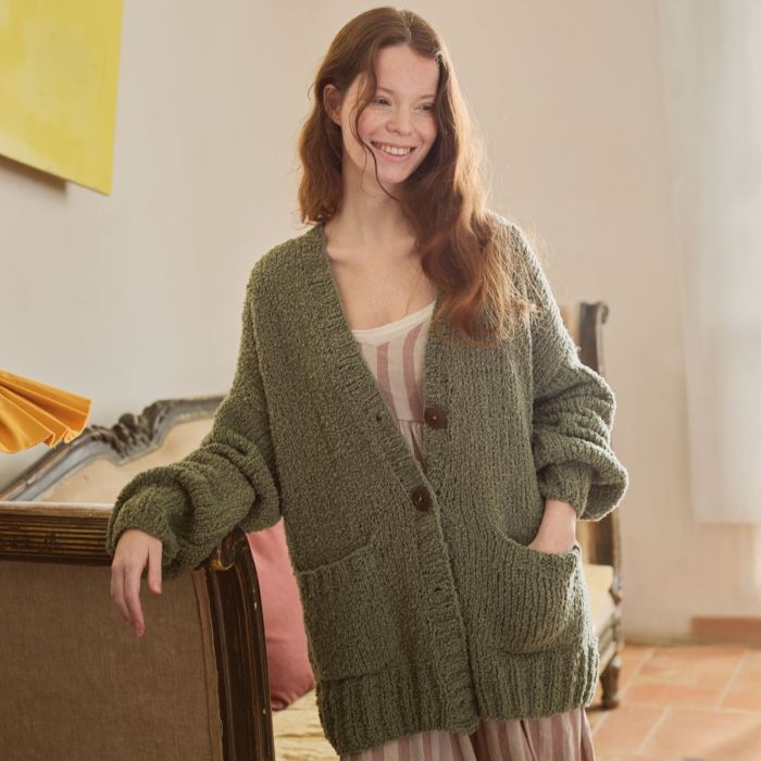 Knit a long cardigan with pockets using Concept Sussurro, a bouclé-textured wool that provides warmth and a plush feel. Its open, comfortable design is perfect to pair with any winter outfit. Knit a versatile, cozy piece you’ll want to wear every day.