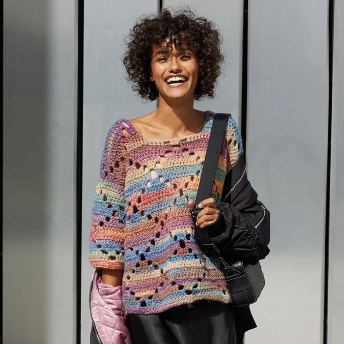 Give your wardrobe a unique touch with this crochet sweater featuring large lace diamonds, designed by Marie-Claire in collaboration with Katia. Crocheted with our popular Katia Azteca yarn, its multicolor design and timeless style make it a must-have piece. Get the pattern and create your favorite handmade garment for this fall-winter season!