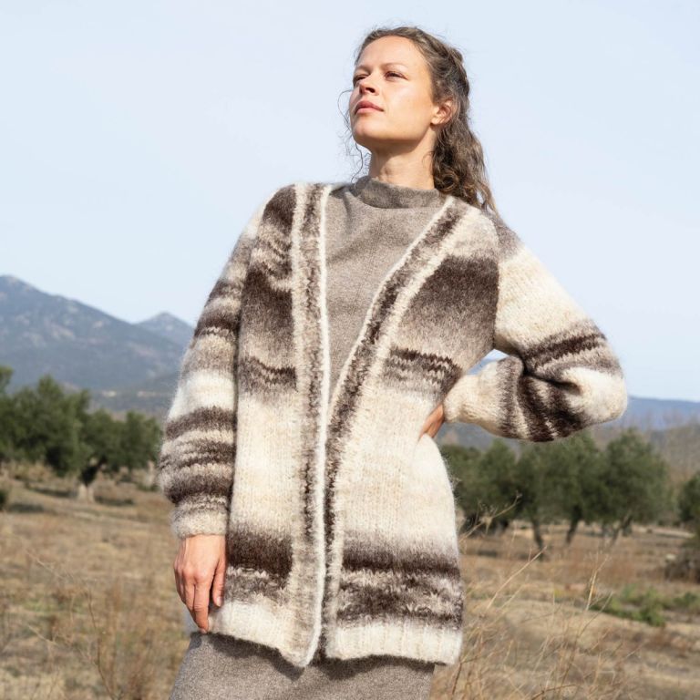 Update your wardrobe with this oversized cardigan pattern, knitted using straight needles and with raglan sleeves for added comfort. The natural color stripes of Pure Alpaca Natural Colors yarn from Concept by Katia make this cardigan a versatile and modern piece, perfect for pairing with any outfit. Knit this timeless garment to stay warm in style!
