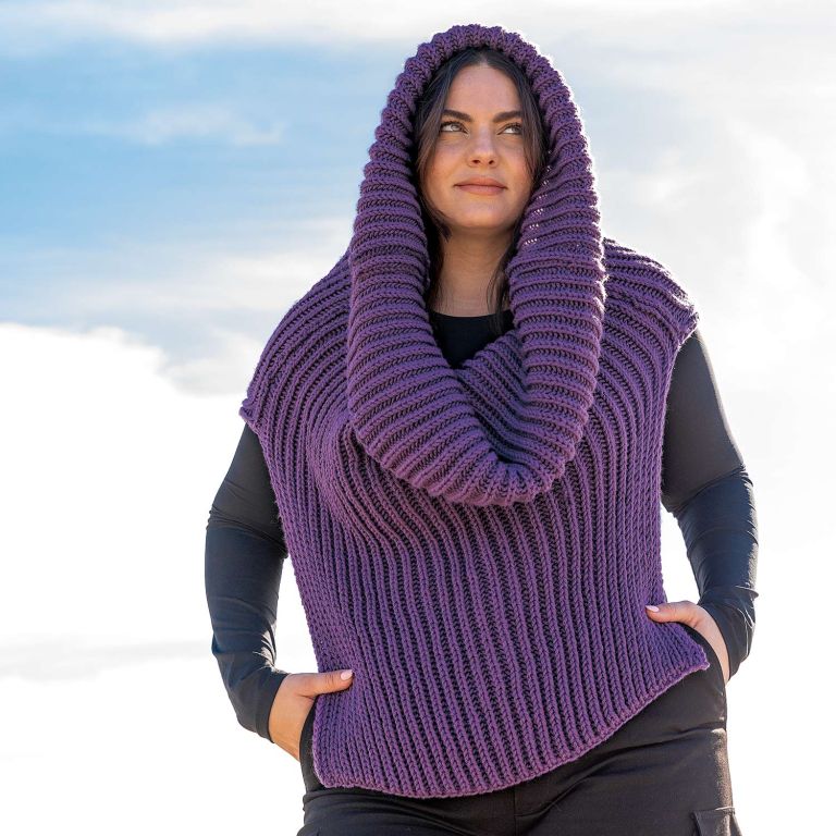 Merino Aran cowl neck sweater Katia Plus pattern Learn how to knit one of the trendiest accessories of the fall-winter season with this Katia Plus pattern, a Merino Aran knitted dickey with a large cowl neck. Have fun with this easy-to-knit pattern in half fisherman’s rib. You can wear this dickey, similar to an open-sided “vest”, in different ways. Its large cowl neck is perfect for cold winter days. Knit it in many colors, it’s the perfect gift!