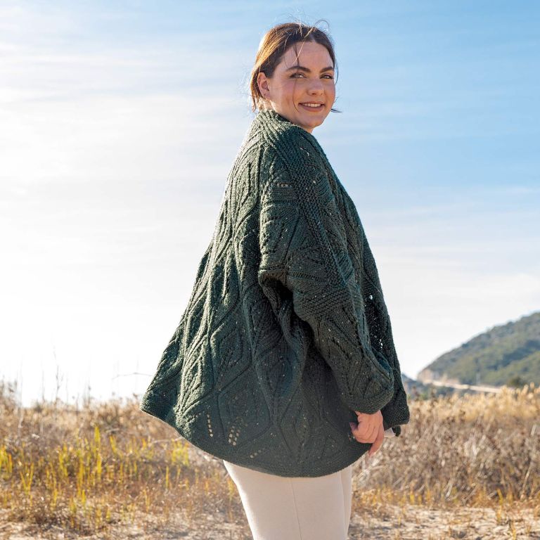 Merino Tweed leaf stitch cardigan Katia Plus pattern Follow the plus size pattern for a leaf stitch jacket in Merino Tweed, available in PDF format at katia.com and in the Katia Essentials 114 magazine. This Katia Plus design for a knitted jacket features straight lines and wide sleeves, without buttons for a carefree vibe. The speckled Katia Merino Tweed yarn gives it a rustic look and is perfect to pair with wool or dress pants. Hand knit this versatile and unique garment!