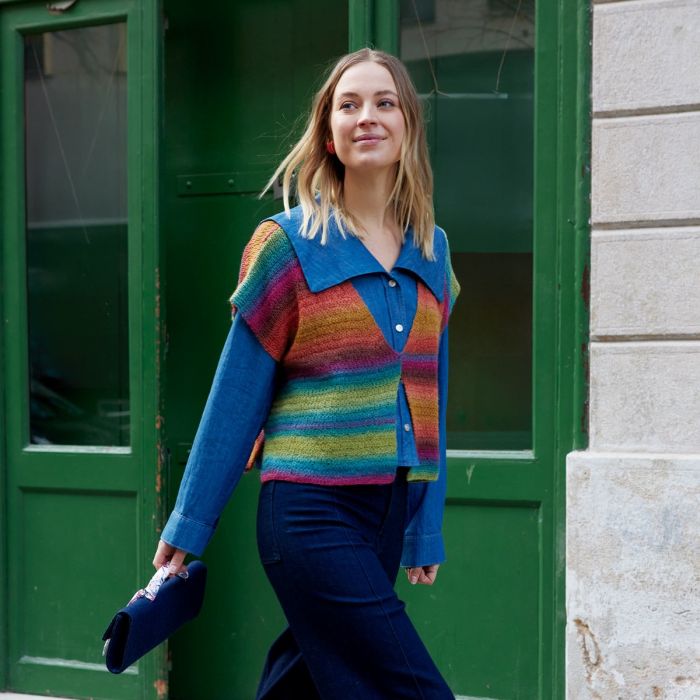 A straight crochet vest with soft multicolor fading, made with Concept Silky Lace Rainbow — a blend of merino and silk in a harmonious long-cycle gradient. A light, modern piece with elegant drape, perfect over a shirt or tee. Download it as a PDF or get it in the Concept Multicolor 2 magazine.
