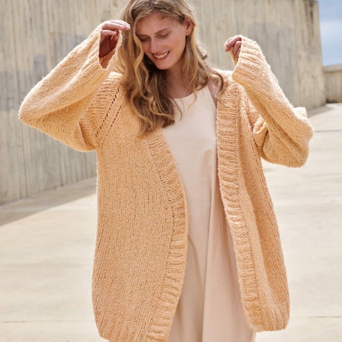 Add an essential piece to your wardrobe by knitting this long cardigan. Featuring long raglan sleeves ending in 2x2 ribbing, and a soft peach color, this cardigan is perfect for any occasion. Pair it with dresses or jeans for a stylish look. Discover the pattern in the All Seasons 6 magazine and start your favorite new project today!