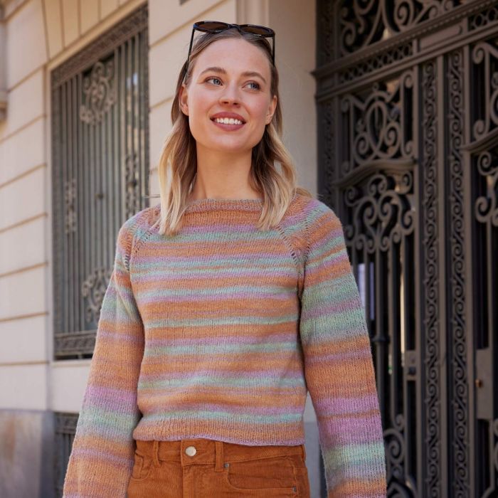 Knit a top-down sweater in the round with Concept Atenea Tones. Its multicolored effect and lightweight feel make it ideal for feminine, timeless garments. Raglan sleeves with lace and cable details add a delicate touch. Find this pattern in the Concept Multicolor 2 magazine and as a PDF at katia.com/us.