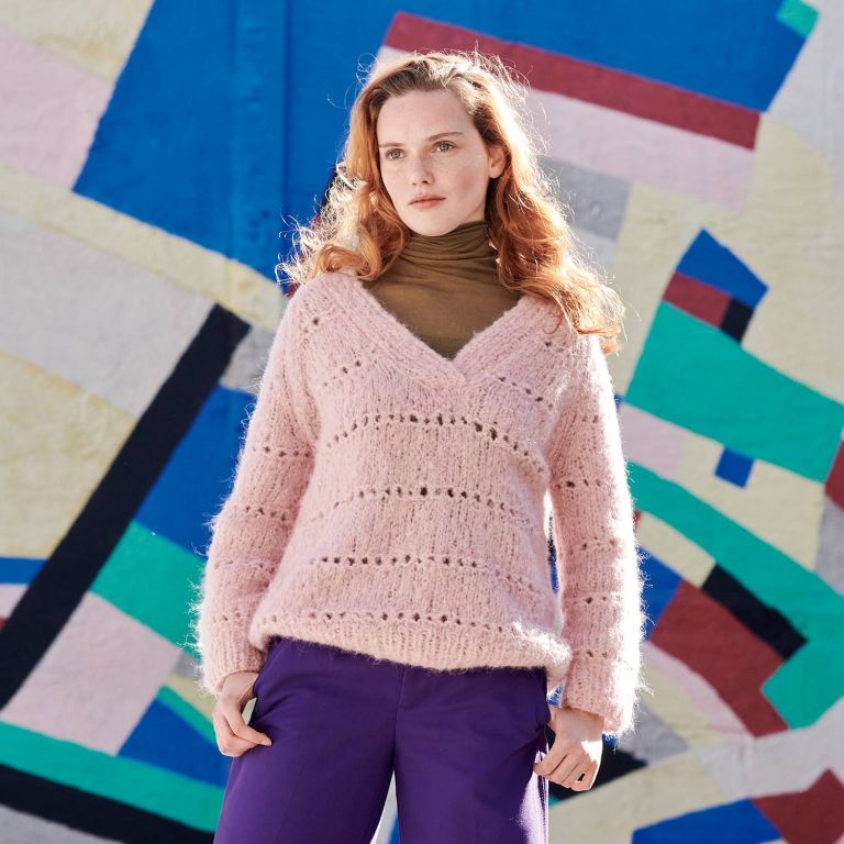 Reiki V-neck lace raglan sweater pattern Wrap yourself in comfort and warmth with this raglan sweater featuring a V-neckline and delicate lace details. Knitted with Concept by Katia’s soft Reiki, perfect for the chilliest days! A timeless piece to stay warm while still looking stylish.