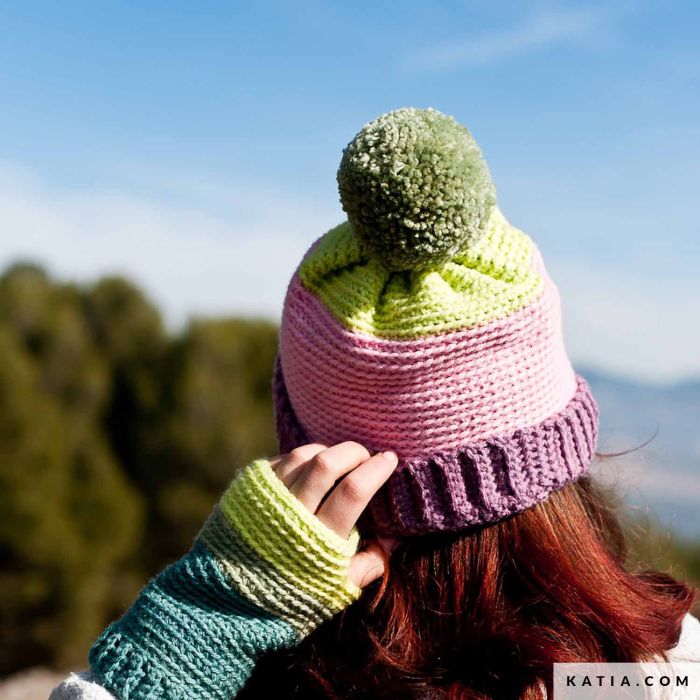 Choose the color combination you like the most from Katia Boomer to make your own Montanna outfit, a youthful hat and fingerless gloves design perfect for beginners. You only need one ball of Katia Boomer to show off your crochet pompom hat and mittens, thanks to the pattern created by @gallimelmas. MEASUREMENTS