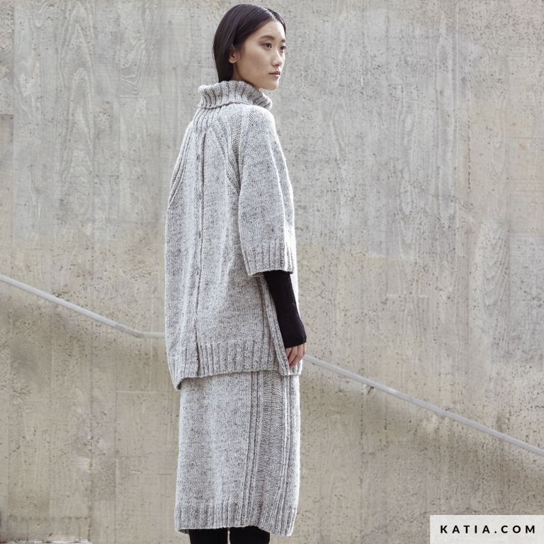 If you want to wear a fully handknitted look, we suggest this matching high neck jumper and midi skirt set knit with Cotton-Merino Tweed. Enjoy knitting a sweater with French raglan sleeves and interesting buttons on the back. Get this pattern with instructions to make this two-piece set that you can wear together or with other garments.