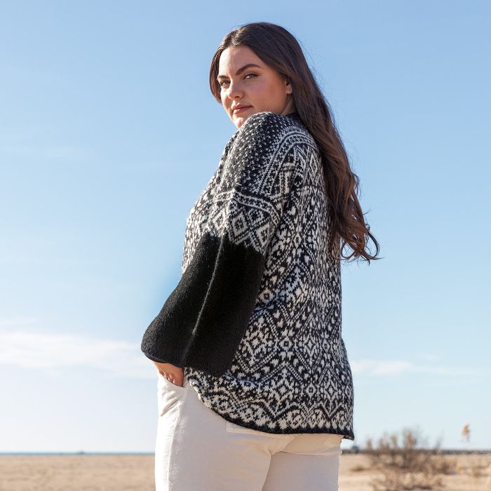 Soft Gratté two-toned colorwork sweater Katia Plus pattern This Katia Plus pattern allows you to knit a spectacular colorwork sweater using Soft Gratté. Use Soft Gratté yarn to create a knitted design with a Perkins collar and straight, wide French sleeves. The black and white colorwork is impressive, only for experts!