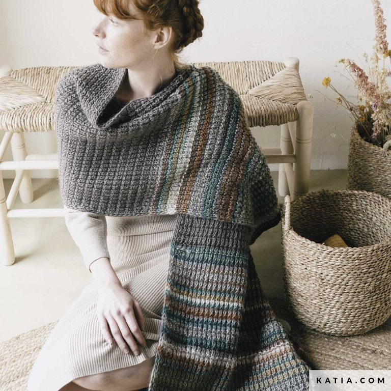 A warm accessory for those cold days, perfect for “knitflix and chill” on the sofa. Wrap yourself in an oversized wrap knit with a textured stitch pattern in a Autumn-inspired colour combination of Kirei and Kirei Color.