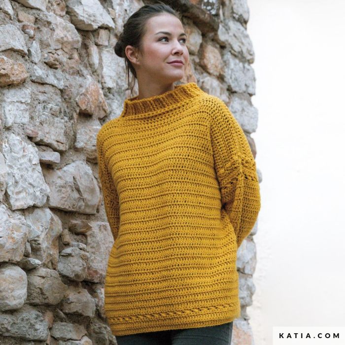 This is proof of the fact that crochet garments are modern, sophisticated and wardrobe staples. We suggest a modern crochet pattern to make an oversized jumper with puffed sleeves. A garment knit in beautiful mustard colour in Merino Aran, ideal to wear with jeans or long dresses.
