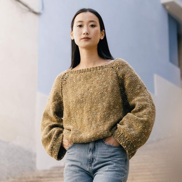 Pluton top-down circular sweater kit The perfect kit to start knitting with circular knitting needles. Make a top-down sweater in the round with a bateau neckline using Pluton, an original speckled yarn. A reverse stockinette women’s sweater with lace at the raglan increases and straight sleeves for a modern vibe.