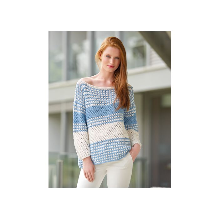 An colourblock jumper with textured panels made with Cotton 100%. Using gater and pattern stitch, use this patternt to create a garment perfect for Summer.