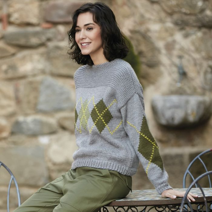 Perfect for intermediate knitters. A comfortable jumper with intarsia on sleeves and front. Knit this jumper using Merino Aran and create a colour jumper for Winter.