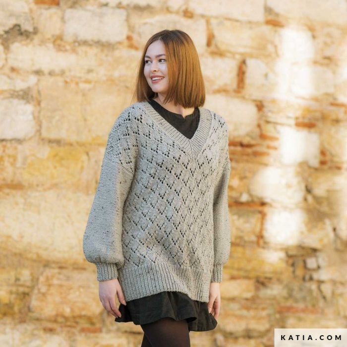 Get ready to knit a classic oversized jumper with a deep V-neck and lace with Merino Tweed for a chic look. Enjoy knitting the puffed sleeves and wide ribbing details. You can find this pattern with instructions for a range of sizes from UK 8 - 26.
