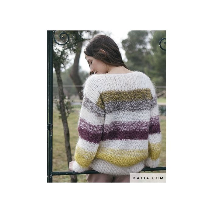 A comfortable, versatile and must have jumper that is both light and cozy thanks to the lightness of Ingenua mohair yarn. Easily knit a jumper with reverse stockinette stitch and side seam. A striped garment you can knit in whichever trendy colours you choose! This knitting pattern is perfect for beginner knitters.