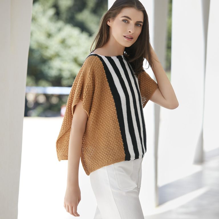 Using a combination of stitches; garter, pattern and stripe, create this women's summer jumper featuring a statement panel front using Cotton Alpaca. Cotton Alpaca is a soft comfortable cotton and this garment can be knitting in a range of colours available.