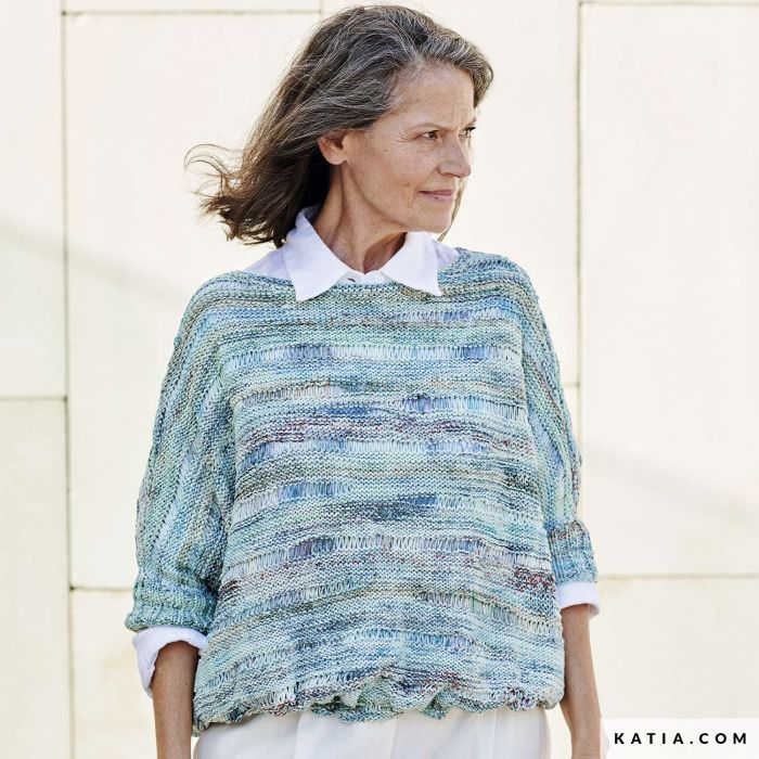 Marmara French-sleeve knitted sweater An easy women’s sweater combining garter stitch and dropped stitches. With three-quarter length batwing sleeves and a cord at the waist for a more youthful look. You will be amazed by the cool touch of Marmara, thanks to the softness of its silk content. Its subtle shine goes perfectly with the yarn’s faded color palette.