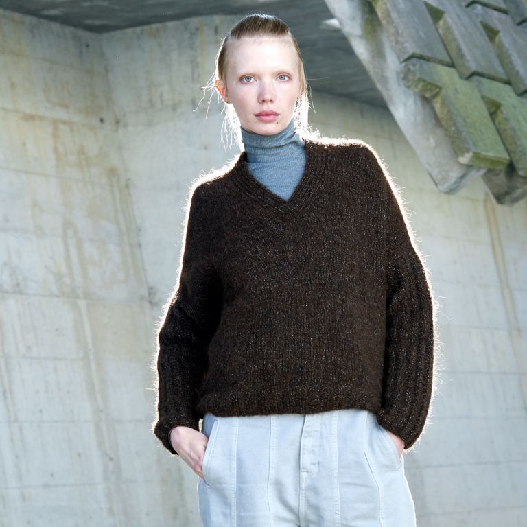 Alpaca Silver V-neck sweater knitting pattern This women’s sweater is knit with Alpaca Silver in a pretty chocolate color with subtle shine. It features a V-neckline and tuxedo collar, and is an elegant, lightweight, and warm garment.
