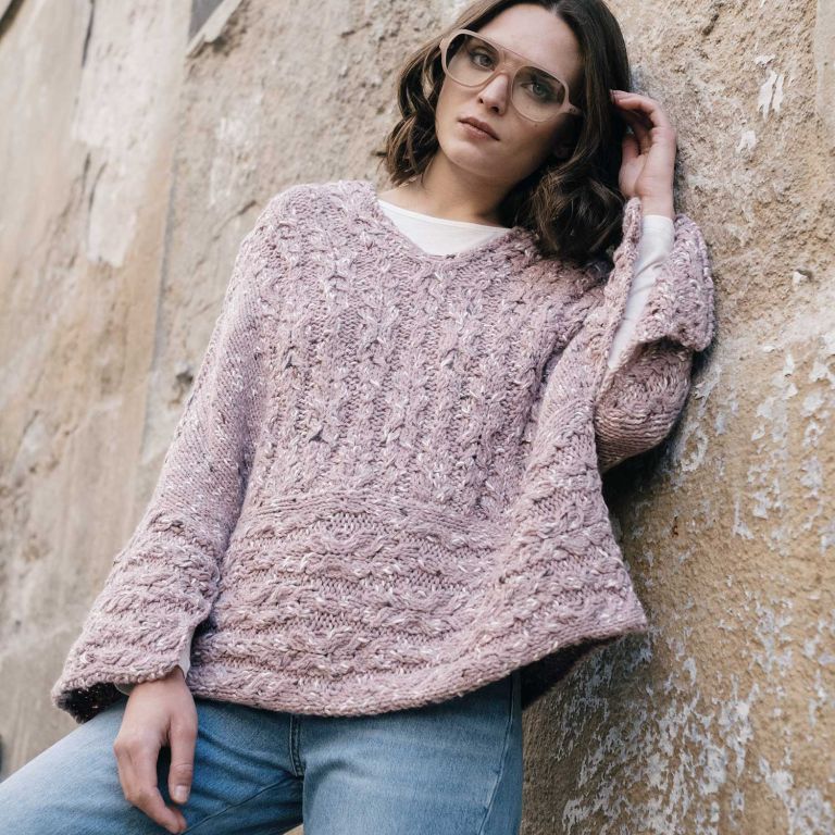 Pluton open bell-sleeve sweater pattern This poncho-style sweater is knit in two directions with Pluton, a beautiful fantasy yarn with a multicolor tweed effect. This pattern features a V-neckline and wide sleeves with large side slits.