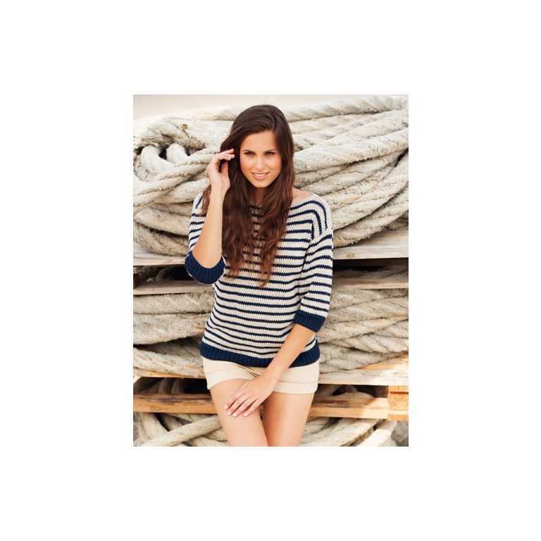 Knit this jumper in fine blue and beige stripes. This is a classic seasonless design suitable for all ages and available in sizes 8 to 22 to knit in Alabama.