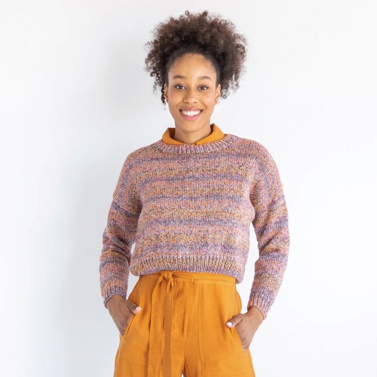 Free cropped sweater pattern knit with 1 ball of Rocket Beginner, take off like a rocket and level up knitting your first sweater with just one megaball of Katia Rocket. Follow this free pattern to knit a cropped sweater with long sleeves. Enjoy a unique result, thanks to the special colorways of Rocket yarn, blending multicolor heathered yarn with muted striped effects.