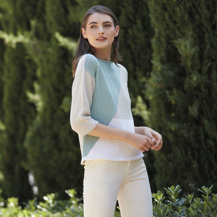Tricolour women's jumper using Cotton Alpaca. Knit this comfortable and youthful knitted women’s garment with this intermediate level pattern and a combination of stitches. Perfect for developing knitters.
