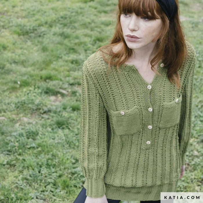 For knitters that are passionate about retro style, here is a pattern inspired by the polo style sweater from the 1960s. A sweater with lapels and decorative front pockets, both details completed with contrast wooden buttons. Knit this novelty lace sweater in your favorite Merino 100% color.