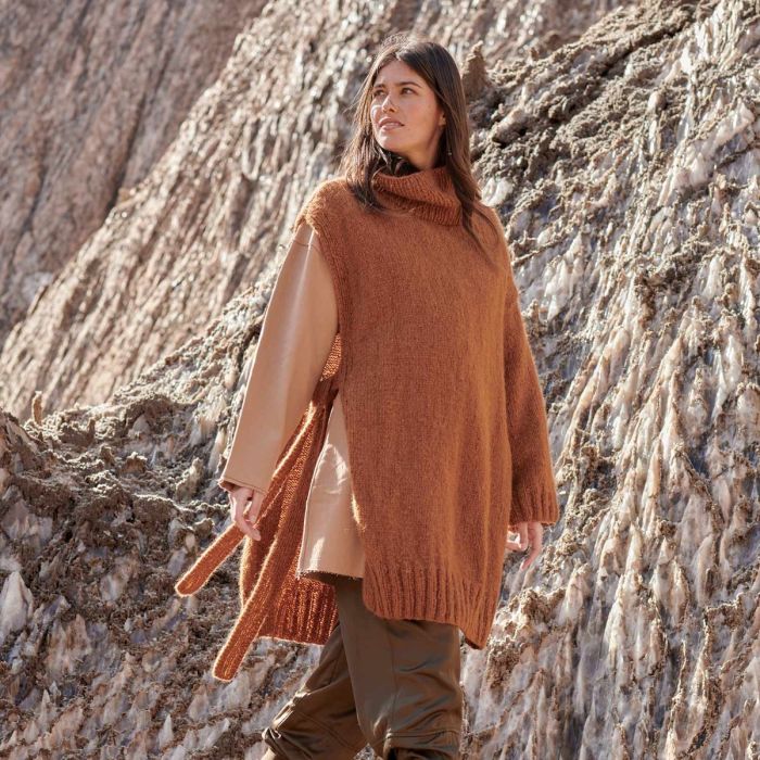 Discover originality with our one-sleeved sweater pattern, knitted with the soft and lightweight Light Alpaca Merino by Concept by Katia. This asymmetrical and avant-garde design features a high neck, a straight sleeve, and an open side fastened with ties. Ideal to stand out in style and comfort. Get ready to knit this unique piece!