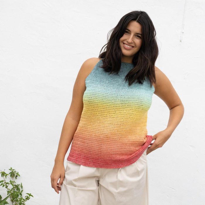 Discover how easy it is to make this sleeveless crochet top with Katia Harmonia Lux, the shimmery version of Katia Harmonia. With just two balls of yarn, create a perfectly symmetrical front and back. The ideal project for beginners who want to crochet their first stylish and cool garment.