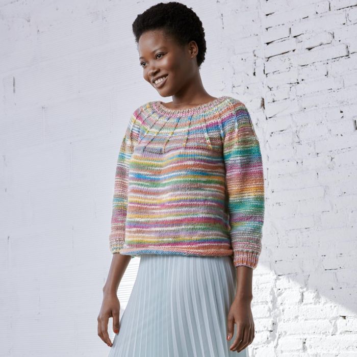 Discover our sweater pattern knit using circular knitting needles and Paradise Merino yarn by Concept by Katia. This airy chainette-type yarn, made from extrafine merino wool, offers a voluminous texture in cheerful colors. Designed top-down, this sweater features reverse stockinette stitch, French sleeves, and raised ridges around the yoke. The rolled hem without any ribbing creates a charming effect. Perfect for pairing with flowy dresses or jeans. Get inspired and create your own handmade style!